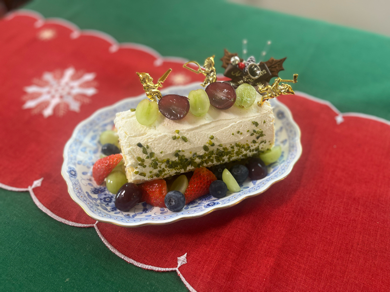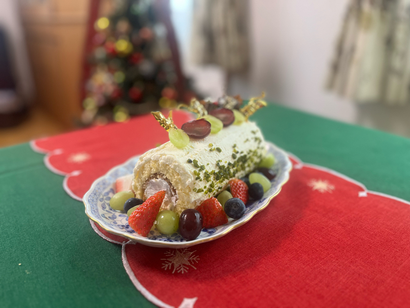 今年のクリスマスケーキはブッシュドノエル。ぶどうとピスタチオでちょっと大人っぽい感じにしてみた。