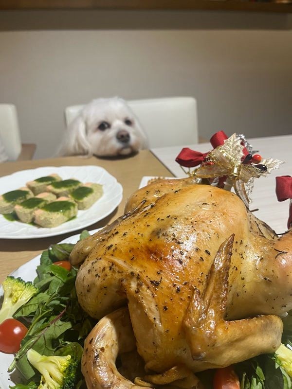 毎年恒例のクリスマスチキンは、義実家で焼いてふるまってきた。喜んでもらえたがブラン君(義実家のマルペキ)には試練の時間だったね…。申し訳ない。