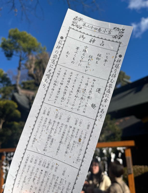 毎年恒例のおみくじ。今年は小吉だった。吉と小吉ってどちらがいいんだっけ…。